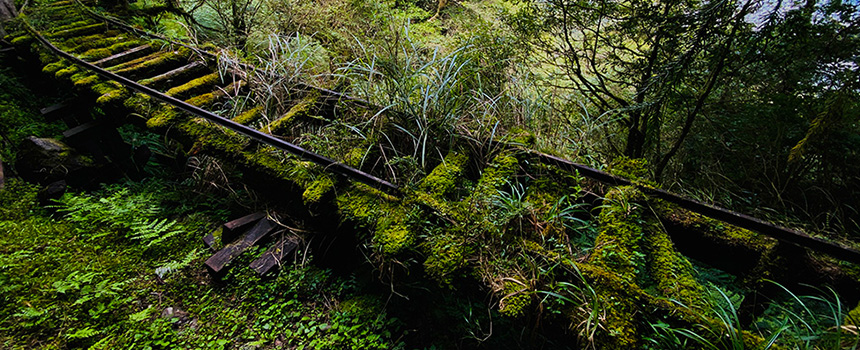 上午9:40.進入"見晴古道",順著青苔蔓延隱密的鐵的痕跡緩緩步行…..